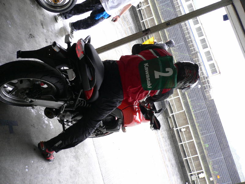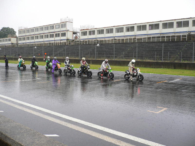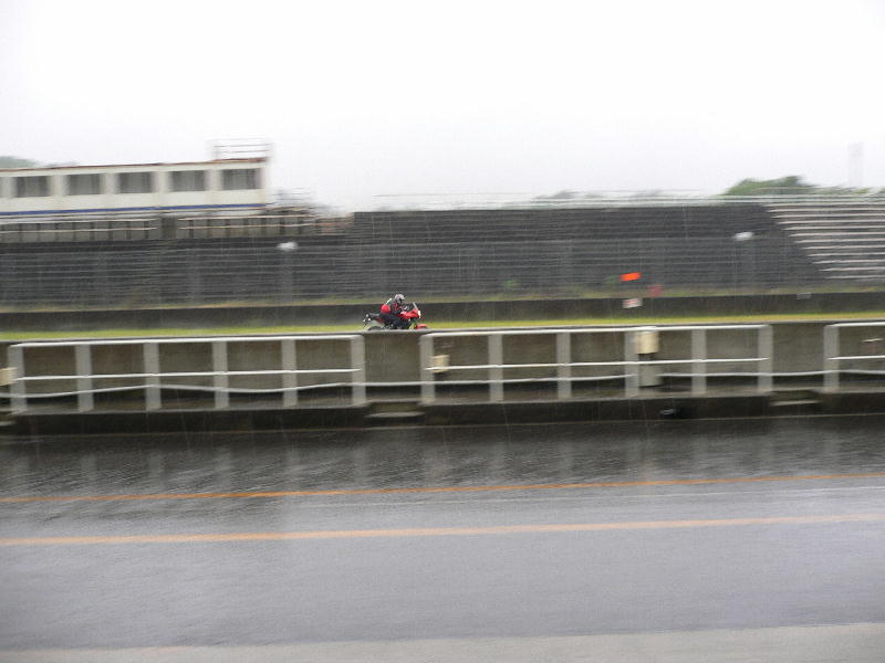 この雨の中、走行約5kmの新品タイヤで走る気はありませんでしたので、ツナギに着替えることもなく走行を見学。