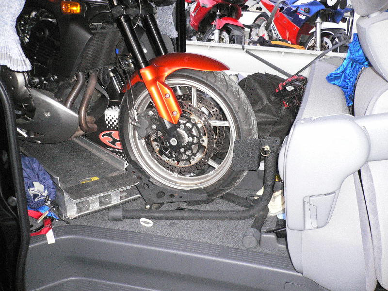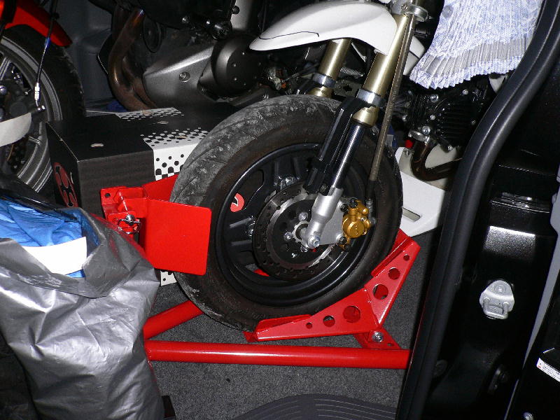 フロントスタンドの関係で単純に真っ直ぐ突っ込んでるだけですので、バイクが干渉しないように少しずらして積んでます。