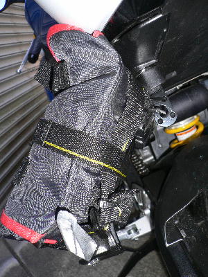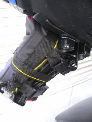 袋本体のベルトと荷締め用のタイベルト2本で縛ってます