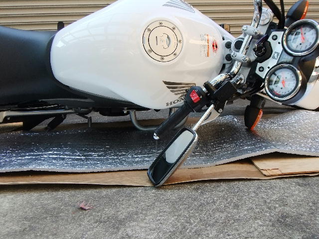 ミラーはもちろん、ハンドルのバーエンドもレバーも接地してます